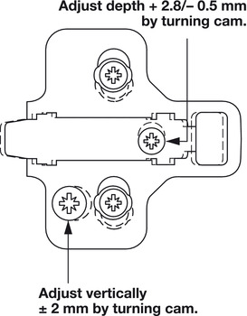- Automatic Adjustment Response feature: a slight turn of the depth adjustment cam or vertical cam quickly positions hinge – eliminating need for manual positioning by loosening screws.