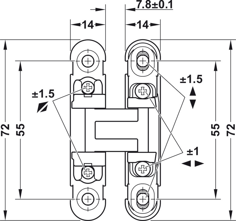 - Adjustment facility : with overlay mounting: Height ±1.5 mm, side ±1 mm, depth ±1.5 mm,with inset mounting: Height ±1.5 mm, side ±1.5 mm, depth ±1 mm