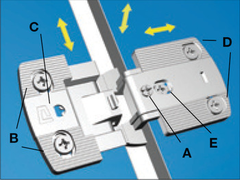 - Door overlay (side to side) adjustment is on the arm component as opposed to the cup component: offering continuous adjustment of +1/-2 mm in both directions