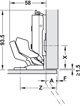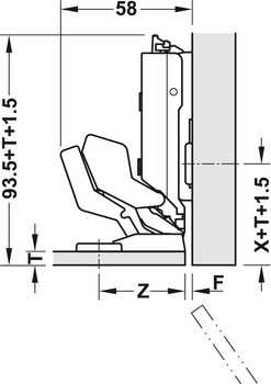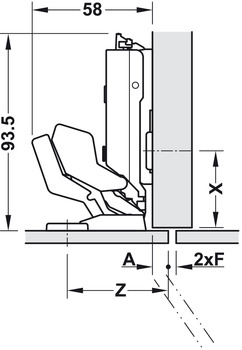 Minimum gap F = 2 mm. Applies to hinge with factory settings, door thickness from 6 to 10 mm with chamfered edges (R = 1 mm) and screw-on dim. Z from 38 to 66 mm.Data Sheet