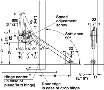 - "S" dimension is the overlay coverage for drop hinge(s)
