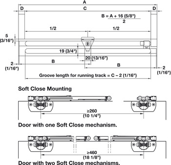- Soft closing mechanism on one side is possible from pitch length of min. 260 mm, both sides from 460 mm. Please order soft closing mechanism set for soft closing on both sides separately.