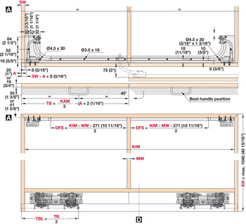 - Installation reference : Highboard/sideboard version: Install running gear bottom runningWall unit version: Install running gear top runningHandle height depends on door thickness: 35–41 mmDistance between handle and door edge: Handle height