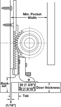- Minimum pocket width: (Door thickness: 16 - 22 mm (5/8 - 7/8) = 57 (2 1/4) or Door thickness: 22 - 32 mm (7/8 - 1 1/4) = 67 mm (2 5/8))