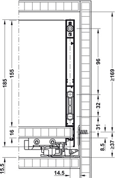 - Installation reference : Installation dimensions: the specifications for internal installation height and installation dimensions of the rear panel are identical to those of the pull out for door front fixing with drawer side height of 185 mm.min. internal installation depth = nominal length + 12 mm