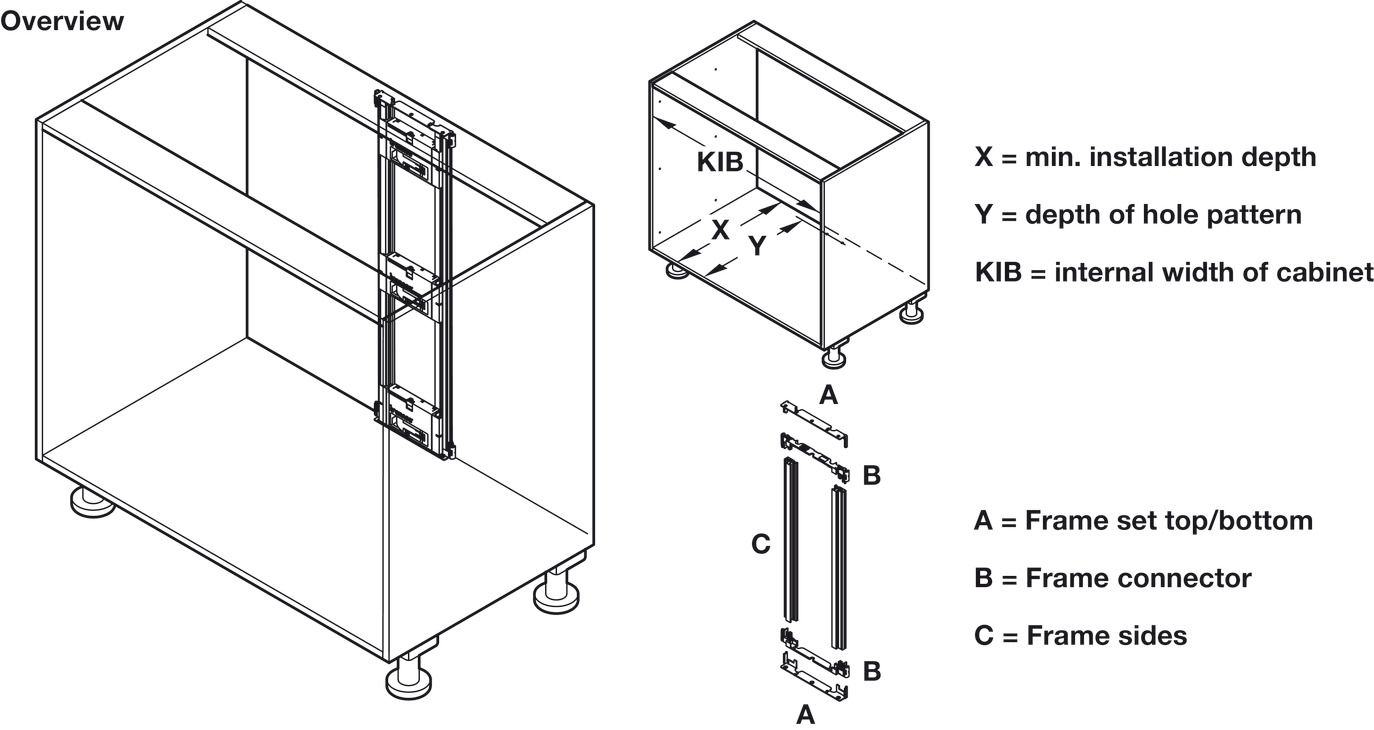 - 2. Frame sides, aluminium 653 mm, including cable, to suit 720 mm high cabinet