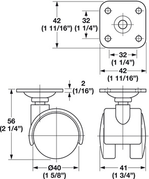 Hafele 660.04.331 Twin Wheel Caster, Plate Mount, Load-Bearing Capacity 77 lbs., 40 mm Without brake