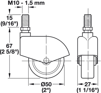 Product Title: Caster, M10 Stem, Load-Bearing Capacity 110 lbs, Wheel Ø50 mm (2"), with threaded bolt M10, without brake