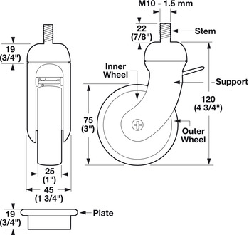 - Material : Outer wheel: Hard RubberInner wheel: PlasticSupport: Reinforced NylonThreaded stem: Steel