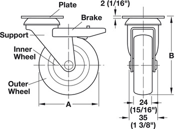 Category: Caster, Plate Mount, with Brake, Load-Bearing Capacity 66 lbs.,
