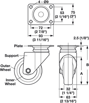 - Material : Outer wheel: TPRInner wheel: NylonSupport/plate: Steel