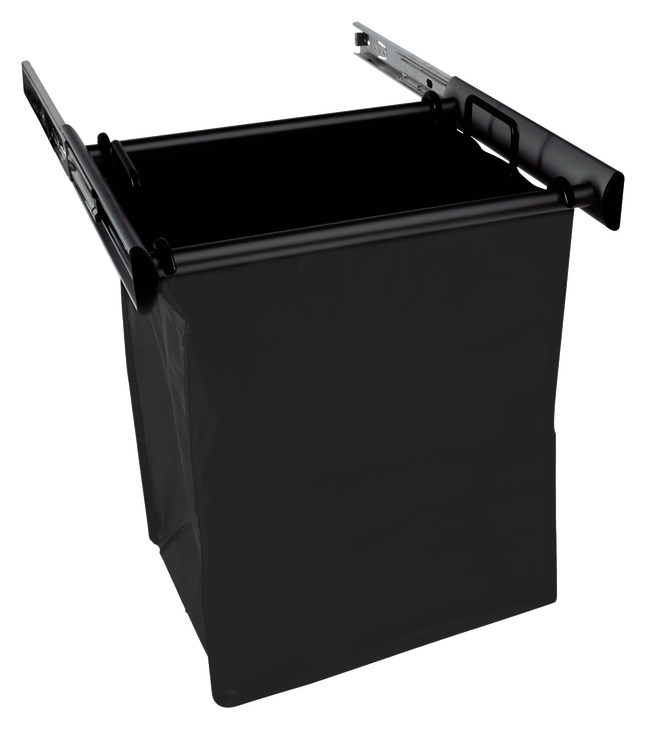 Hafele 807.52.333 Synergy Hamper, aluminum, black, 24" width, pulls out with full extension slides, 2 black nylon bags included