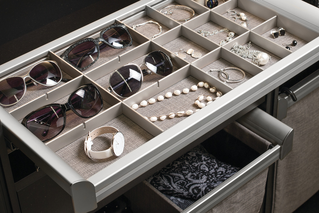 - A completely customizable grid that is specifically sized for jewelry, ties, glasses and more