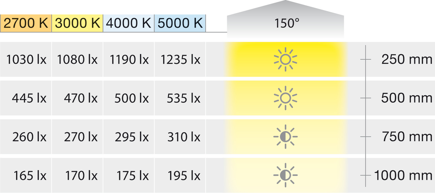 Maximum strip length (visual) describes a strip section with a visually imperceptible drop in luminous flux of max. 30 %. Please note: A strip section with a new power supply that follows immediately is noticeably brighter. Max. wattage-dependent strip length on the driver, see technical data for LED strip lights.Data Sheet