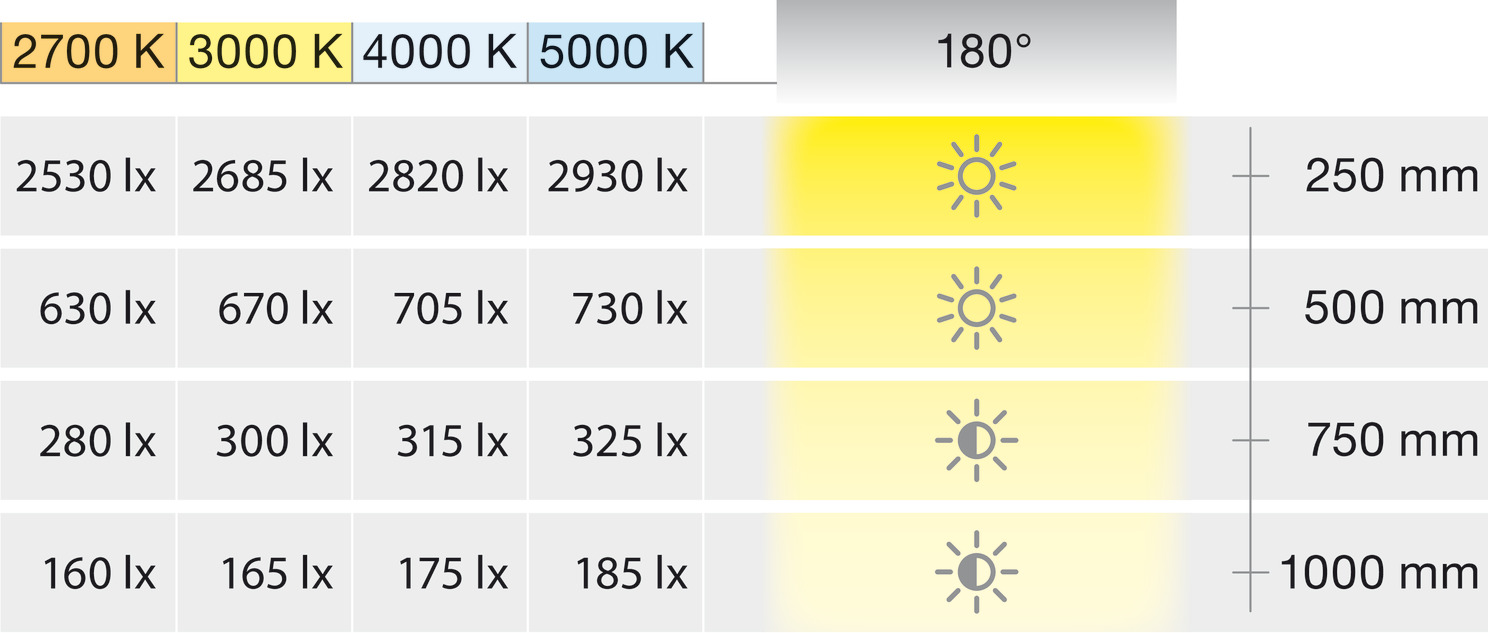 Maximum strip length (visual) describes a strip section with a visually imperceptible drop in luminous flux of max. 30 %. Please note: A strip section with a new power supply that follows immediately is noticeably brighter. Max. wattage-dependent strip length on the driver, see technical data for LED strip lights.Data Sheet