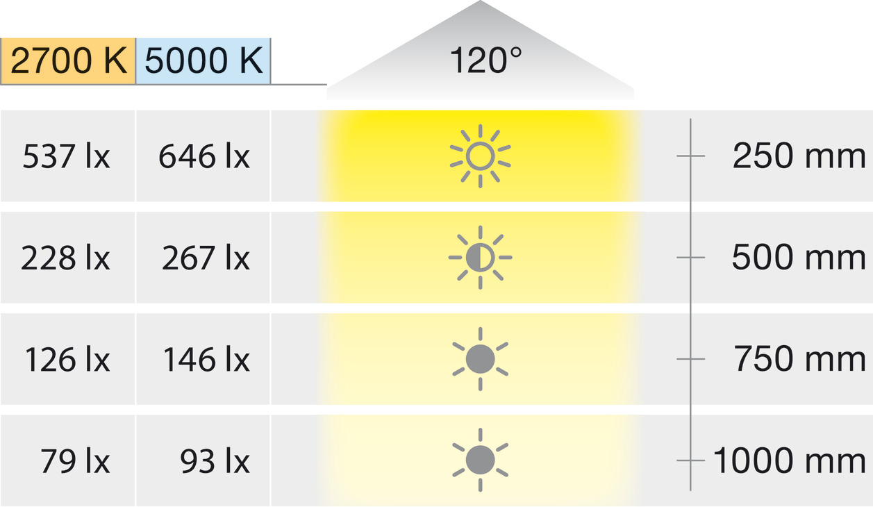 Maximum strip length (visual) describes a strip section with a visually imperceptible drop in luminous flux of max. 30 %. Please note: A strip section with a new power supply that follows immediately is noticeably brighter. Max. wattage-dependent strip length on the driver, see technical data for LED strip lights.Data Sheet