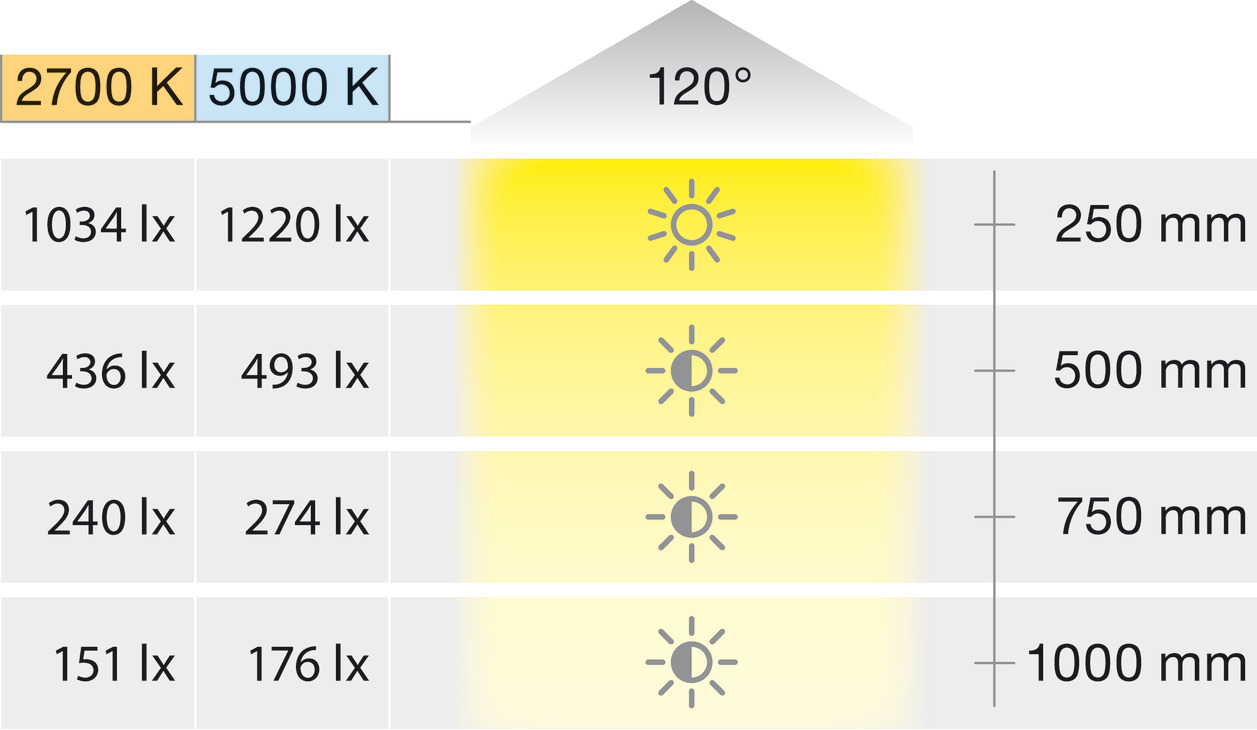 Maximum strip length (visual) describes a strip section with a visually imperceptible drop in luminous flux of max. 30 %. Please note: A strip section with a new power supply that follows immediately is noticeably brighter. Max. wattage-dependent strip length on the driver, see technical data for LED strip lights.Data Sheet