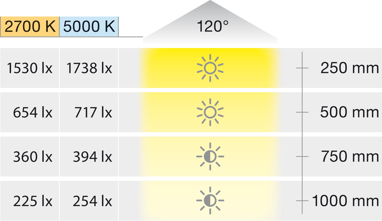 Maximum strip length (visual) describes a strip section with a visually imperceptible drop in luminous flux of max. 30 %. Please note: A strip section with a new power supply that follows immediately is noticeably brighter. Max. wattage-dependent strip length on the driver, see technical data for LED strip lights.Data Sheet