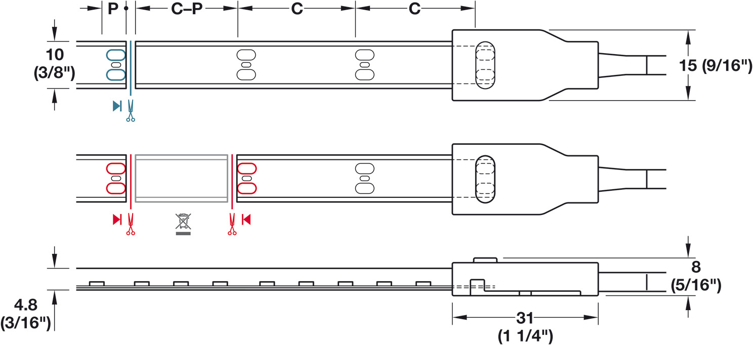 - Installation reference : Optimized light mixtureCool white and warm white LEDs in the smallest of spacesOptimal light mixture without flickeringCut LED strip light to length (one contact side remains on the remainderpiece; reusable). Connect LED strip lights (two contact sides required).C = section length P = length of contact surface